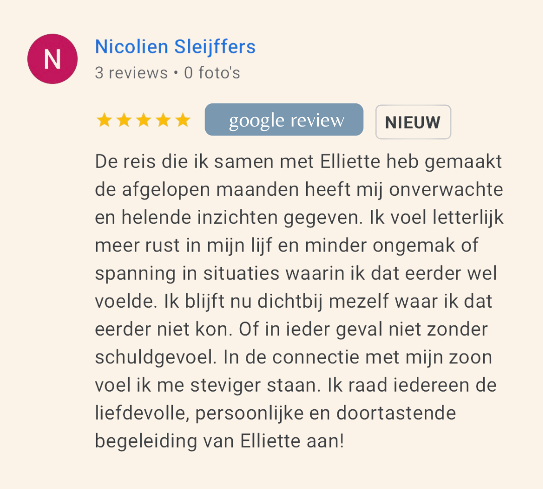 Elliëtte helpt je helder krijgen wat je meeneemt uit je eigen achtergrond en hoe dit doorwerkt in je ouderschap. Ik kreeg meer zicht op wat ik heb meegekregen en onbewust doorgeef, en waarom ik vastliep. De technieken die zij gebruikt waren voor mij nieuw, maar brachten daadwerkelijk iets in beweging.